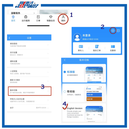 Изтеглете приложението 12306, отидете на „Аз (в долната част) → „Настройки“ → „превключване на версия“ → изберете английски, за да превключите към английската версия.