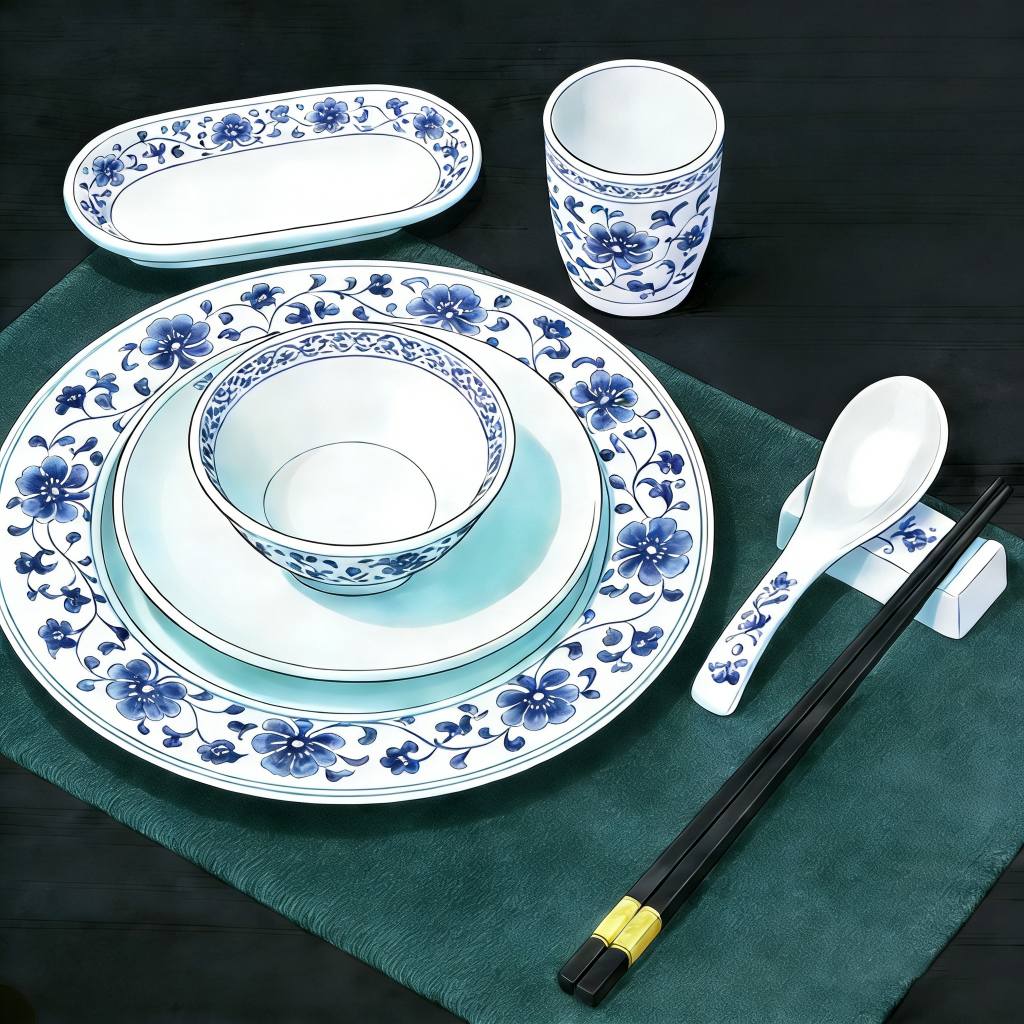 Що се отнася до приборите за хранене, обичайните китайски прибори включват чаши, чинии, купи, чинии, пръчици и лъжици, всички обикновено подредени пред всяка вечеря. Сред условностите „почукването с пръчици по купите“ е забележително табу. Това произтича от практиката на древните просяци, които почуквали купите си, за да привлекат вниманието, докато просят, правейки акта смятан за неучтив на масата за хранене.